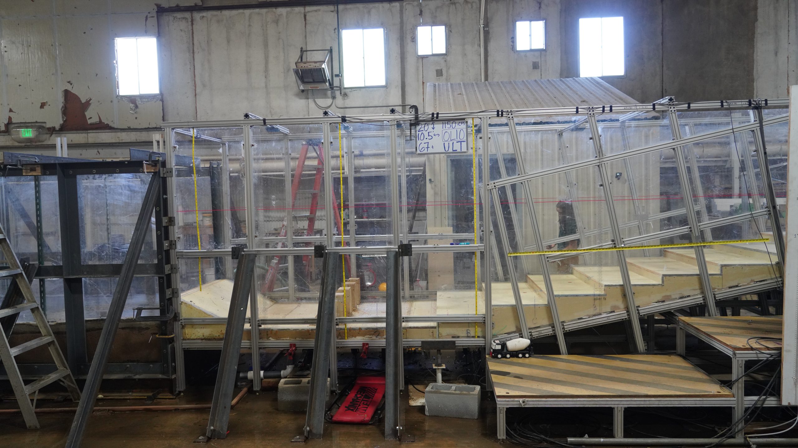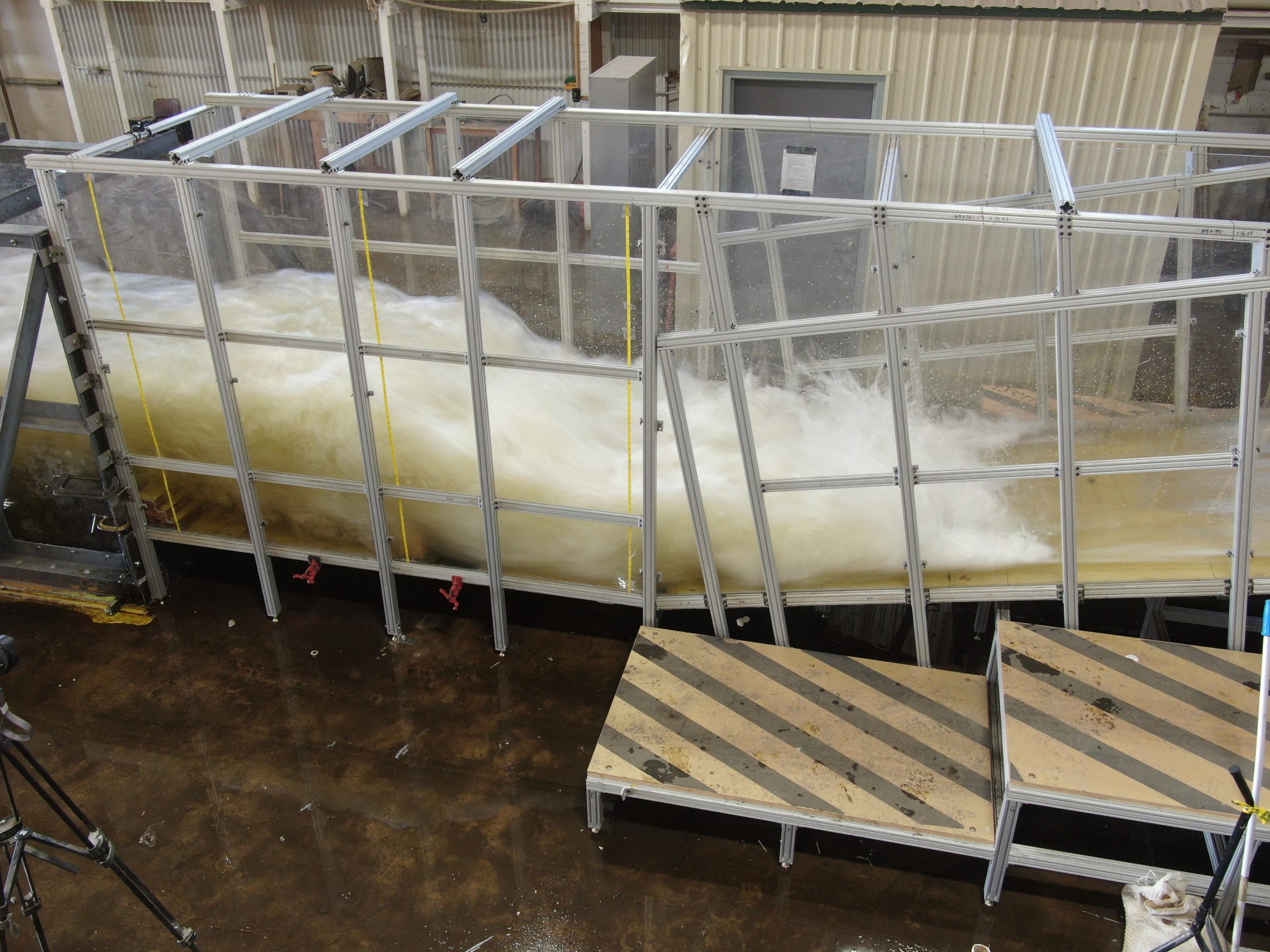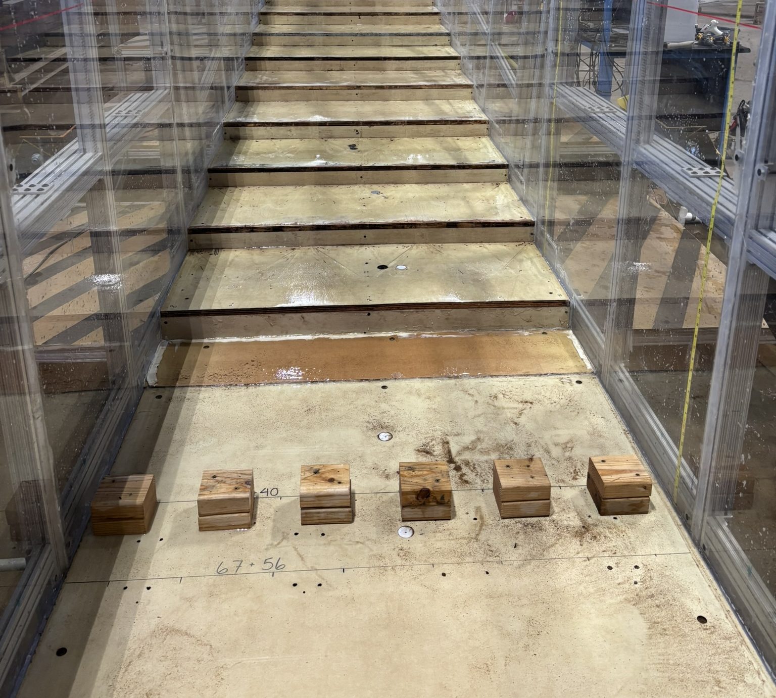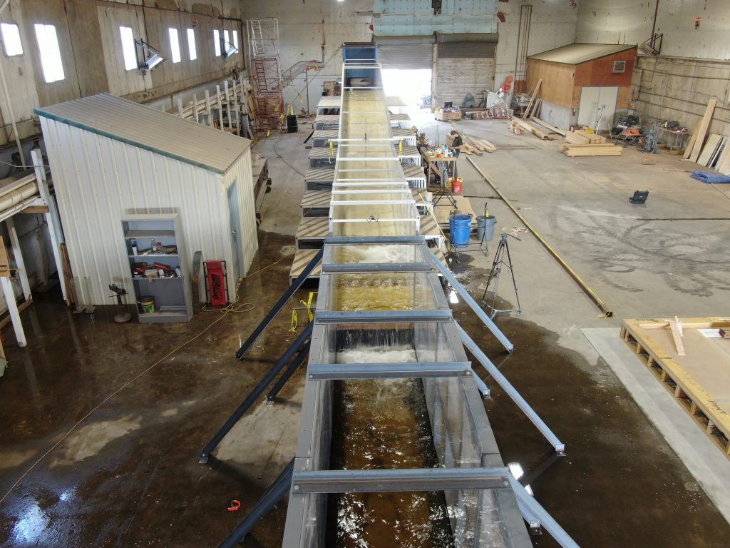 Approximately 400 tests at PMF were performed on over 30 overlays to progressively optimize the lower chute overlay and stilling basin configuration. As of November 2025, testing of all proposed overlays has been completed, and the USACE is creating a final design to construct and perform extensive testing, data collection and analysis on.